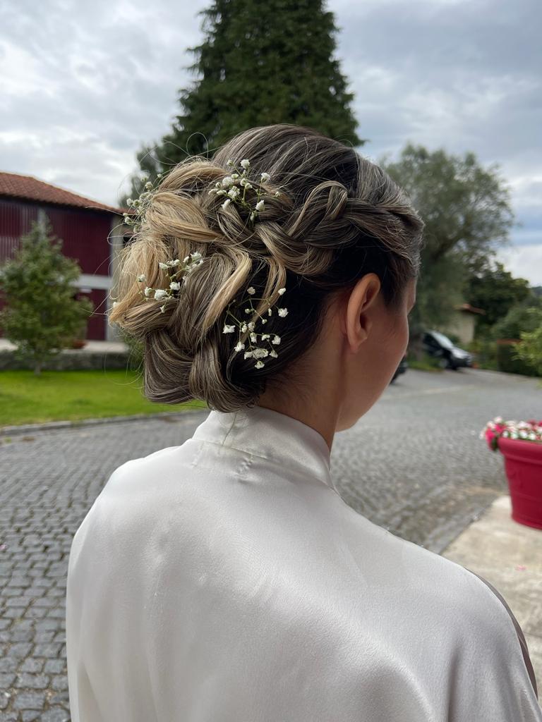 Os penteados de noiva são desenhados à medida, em harmonia com o vestido, o conceito do casamento e o estilo pessoal da noiva, com acabamentos de alta durabilidade, ideais para fotografia, vídeo e para resistir a um dia inteiro de emoções.