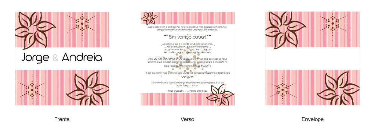 Sofia Mateus oferece-vos assim soluções gráficas de qualidade para que os vossos convites de casamento sejam aquilo que sempre desejaram. Entrem em contacto para mais informações sobre o seu trabalho e solicitem um prévio orçamento dos seus serviços.