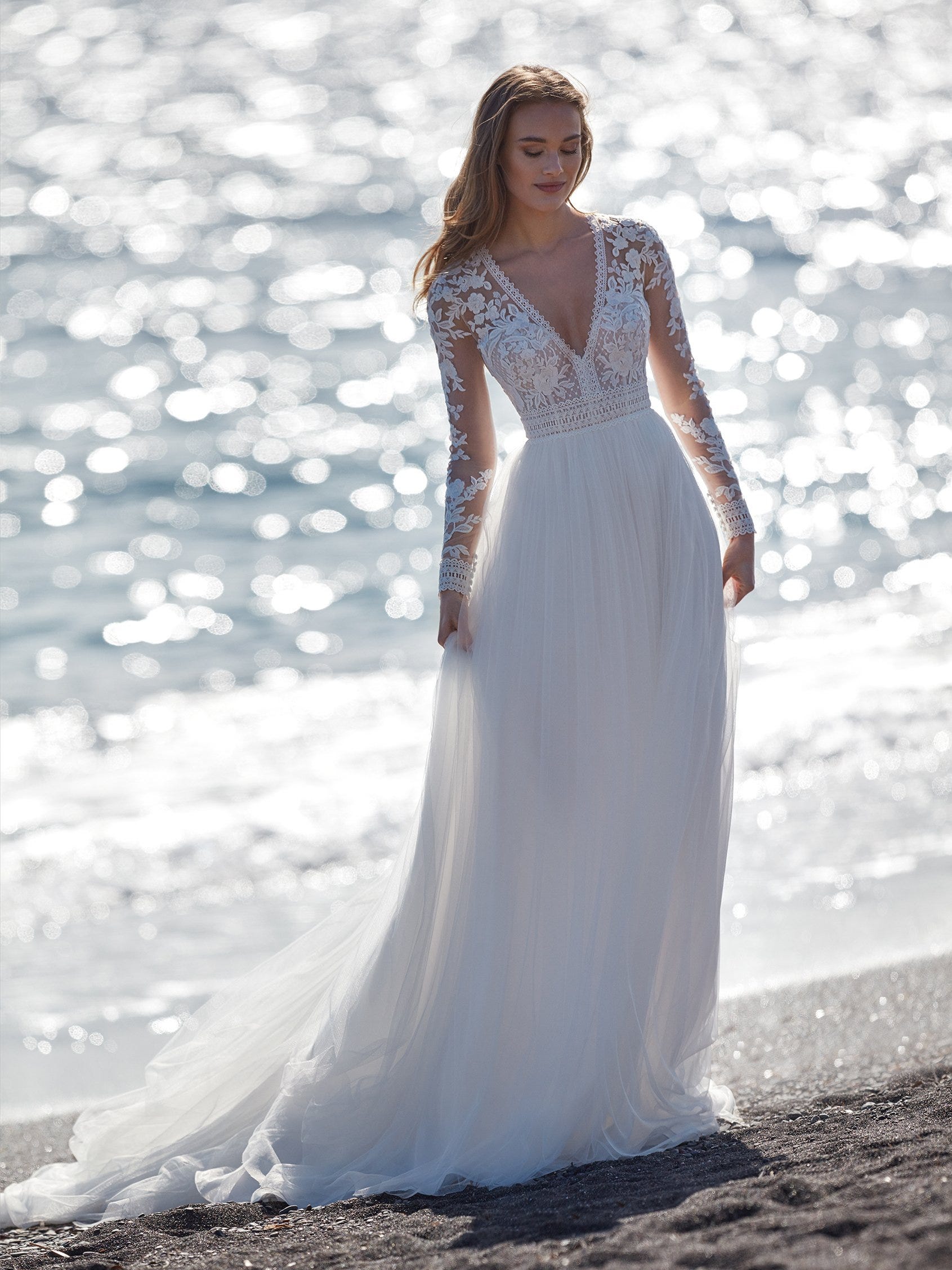 Um aspeto muito importante quando falamos de mangas compridas é o cuidado com os acessórios. Estes vestidos, por terem mais tecido, já chamam mais a atenção, por isso é aconselhável que evite usar pulseiras – porque a manga comprida só por si já ilumina os seus pulsos – e/ou colares, sobretudo se já tiver o peito preenchido com o tecido do vestido. Para vestidos de manga comprida sugere-se, então, que use um bonito par de brincos ou um acessório para a cabeça. Leia também: Os toucados para noiva e acessórios de cabelo mais especiais: descubra-os!