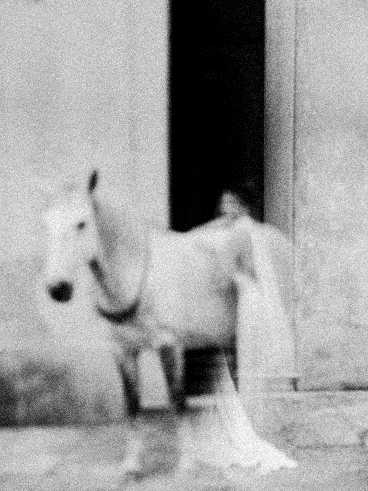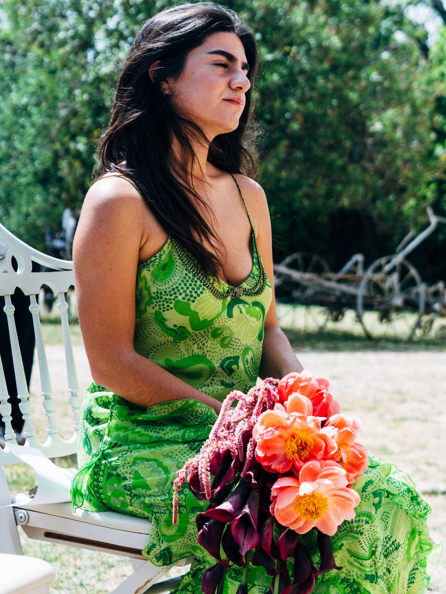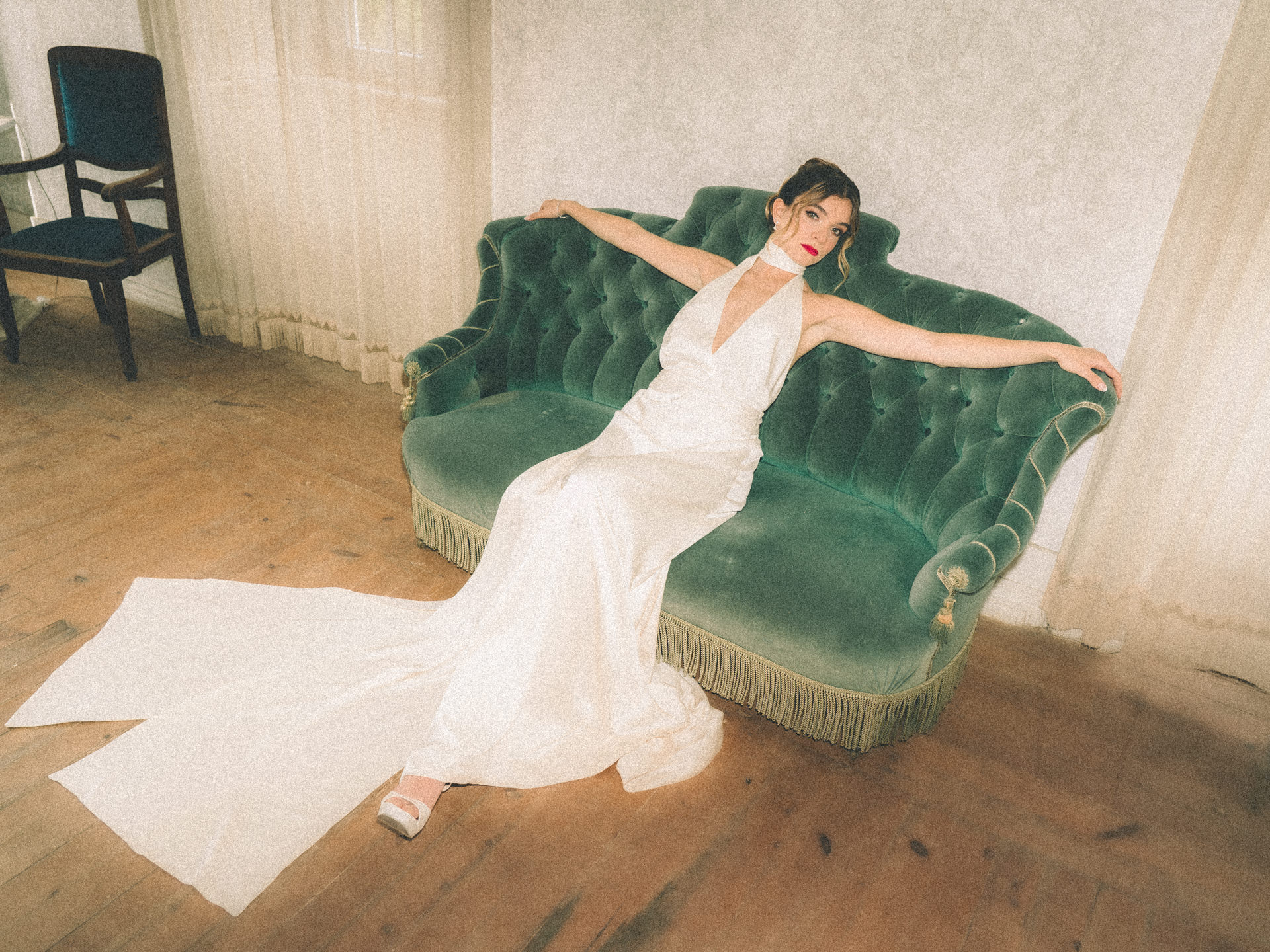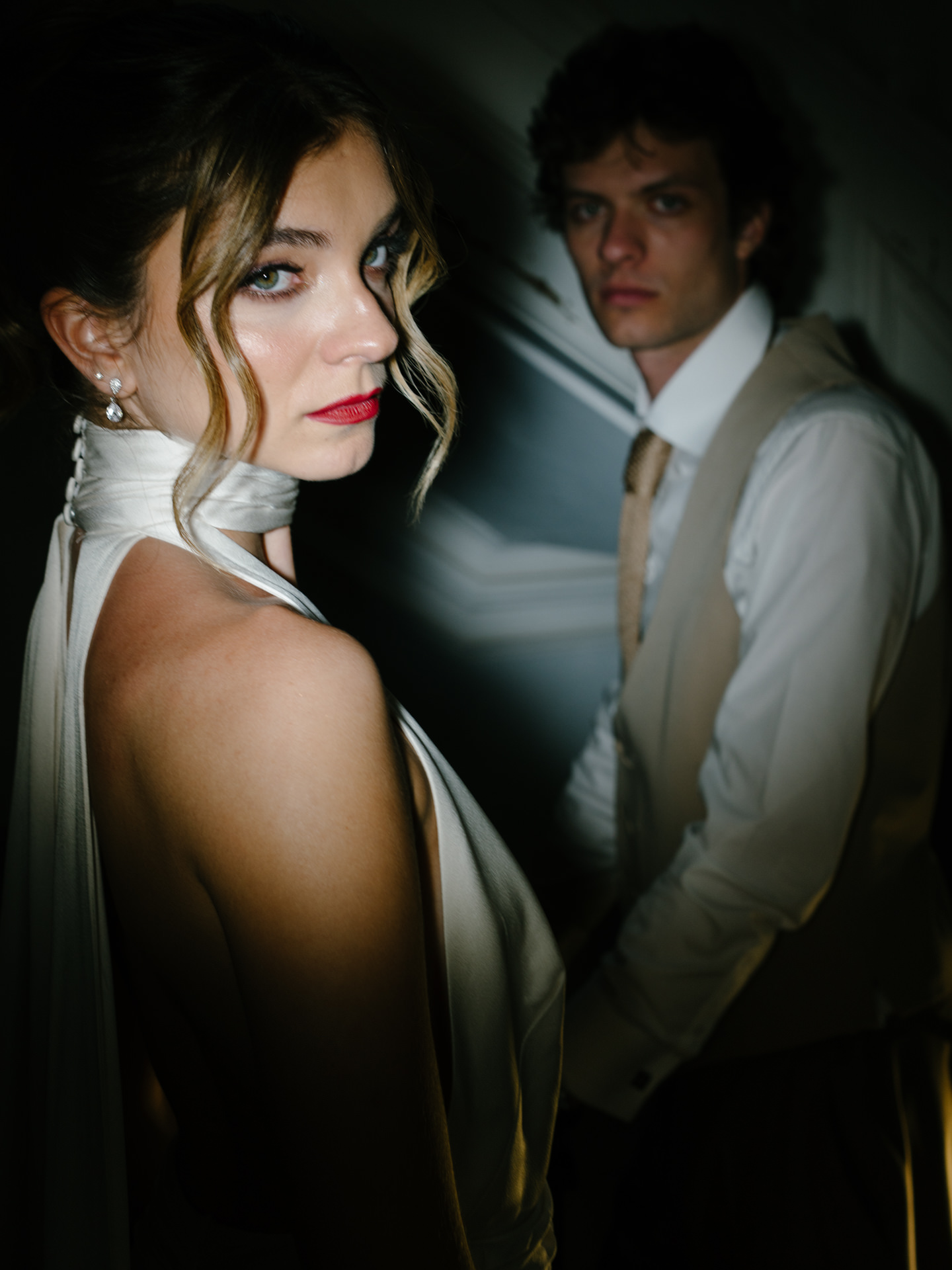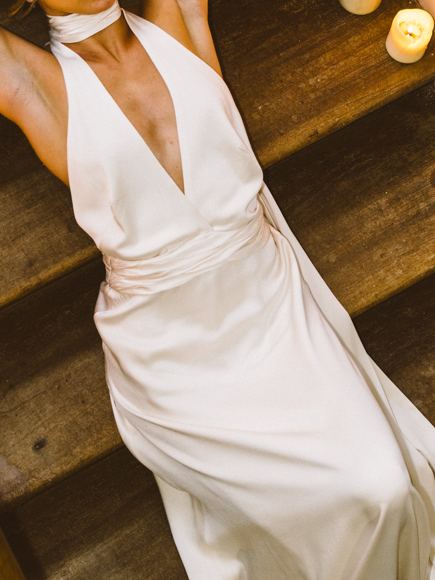 Para o segundo momento, cocktail, jantar e festa, passámos para um vestido mais fluído e mais sensual, com decote profundo e duas tiras de tecido compridas, que funcionavam quase como capas longas. Criavam movimento, leveza e uma presença muito bonita em fotografia e vídeo.
