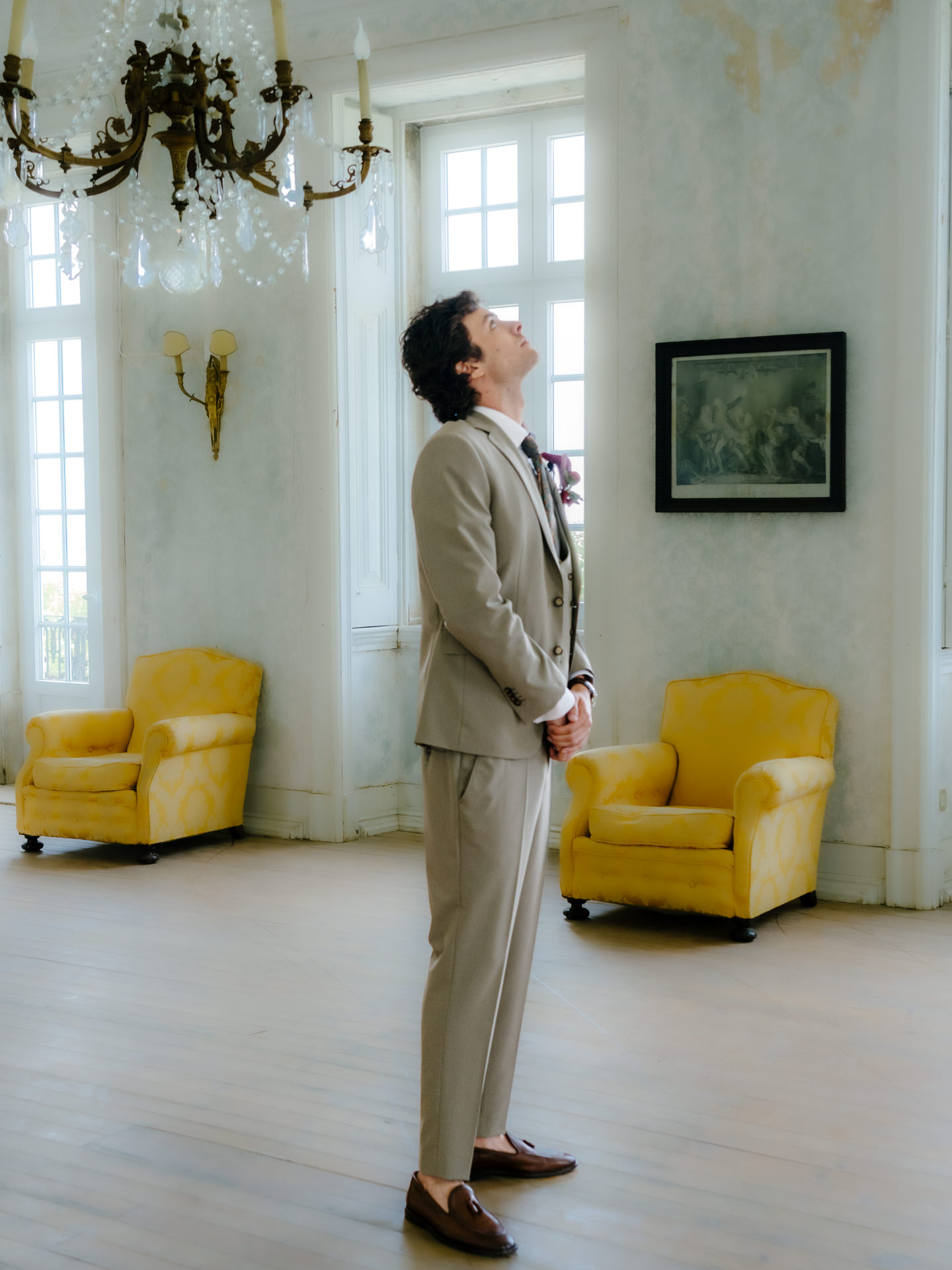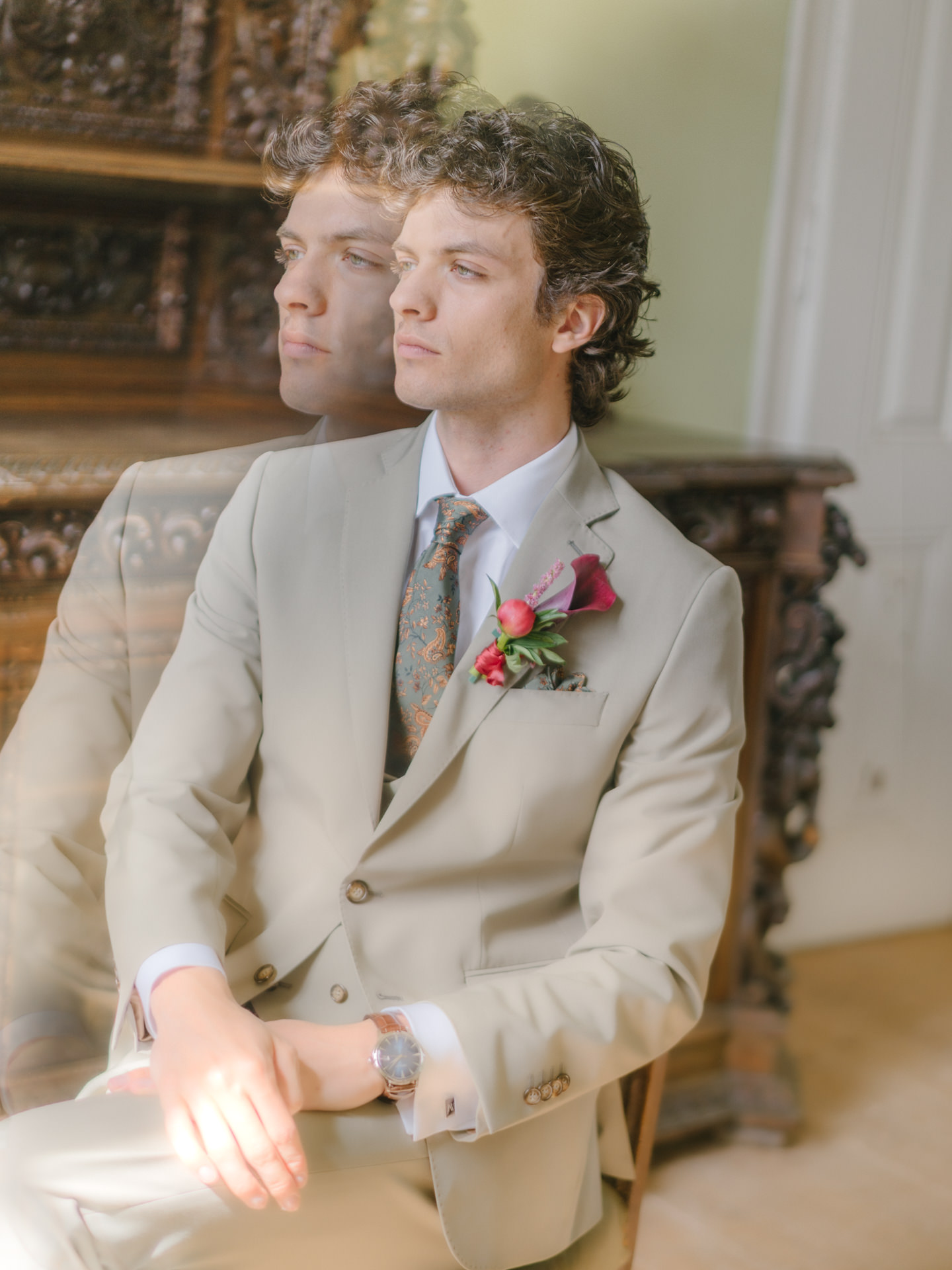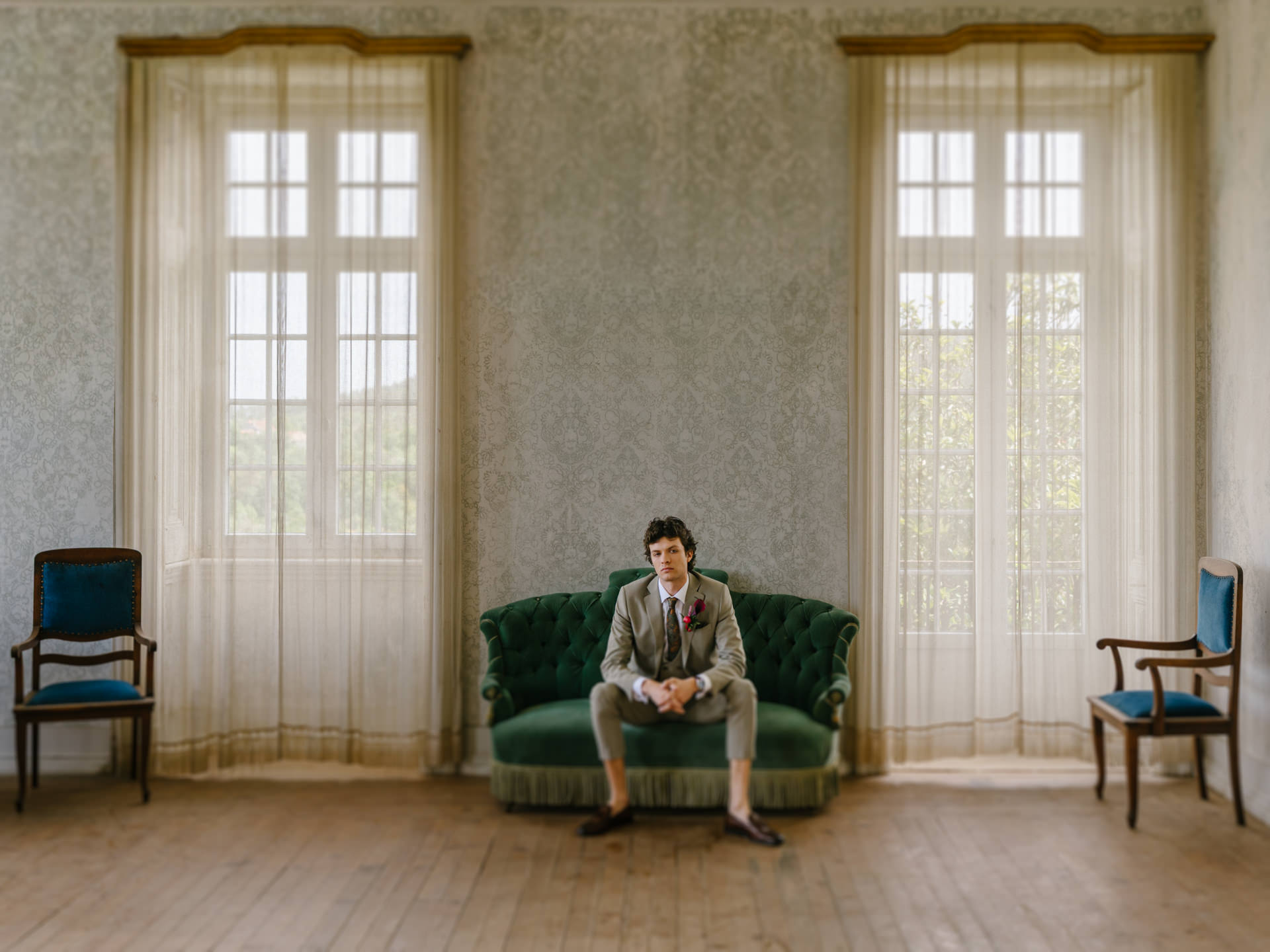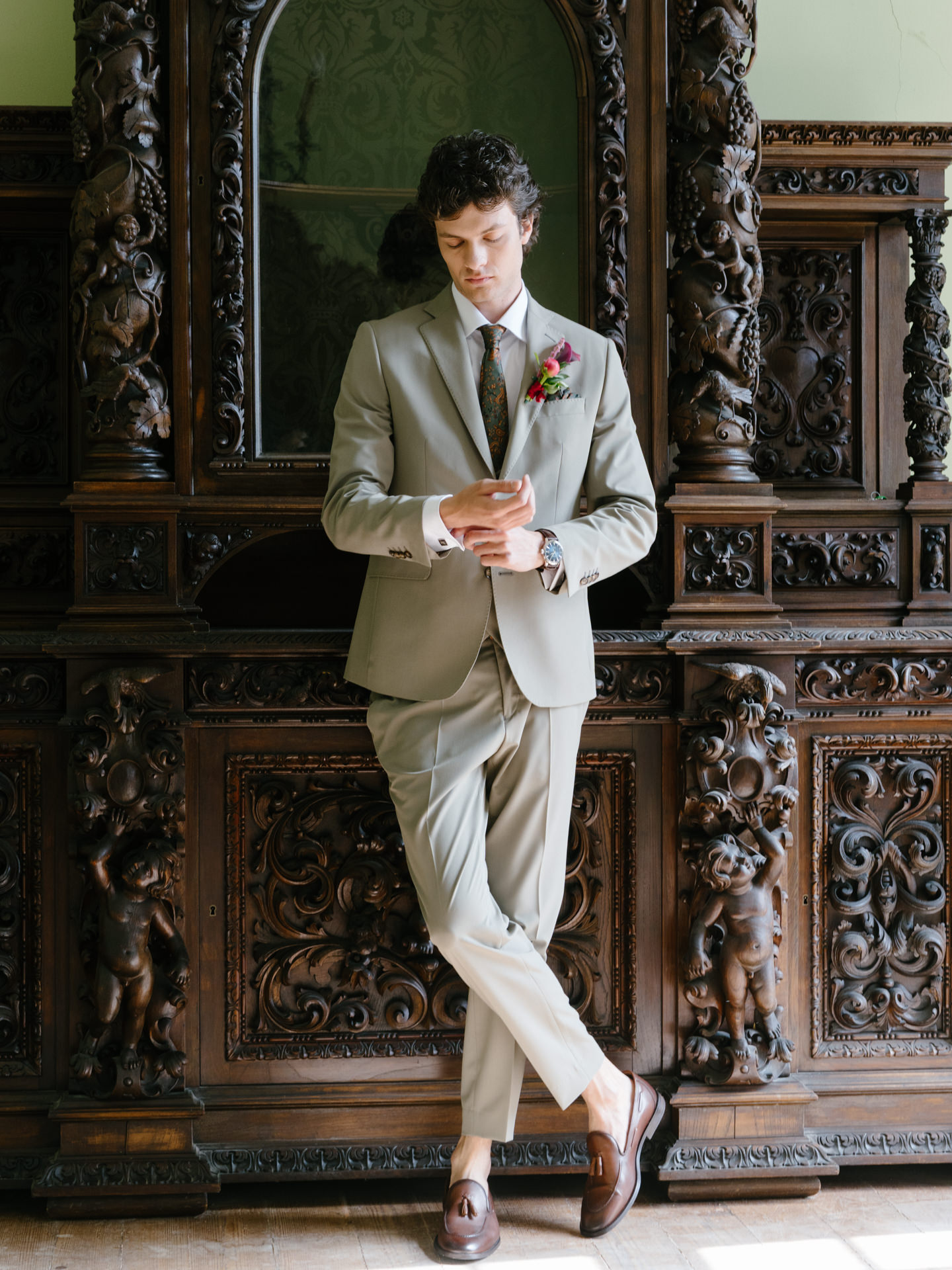 O noivo, vestido pelo Ricardo da Cavemen Suits, também seguiu esta lógica. Usámos dois fatos, ambos em tons verdes, dentro da mesma paleta, com uma inspiração italiana clara: colete, gravata, lenço… e sapatos sem meias. (Sim, somos fãs.)