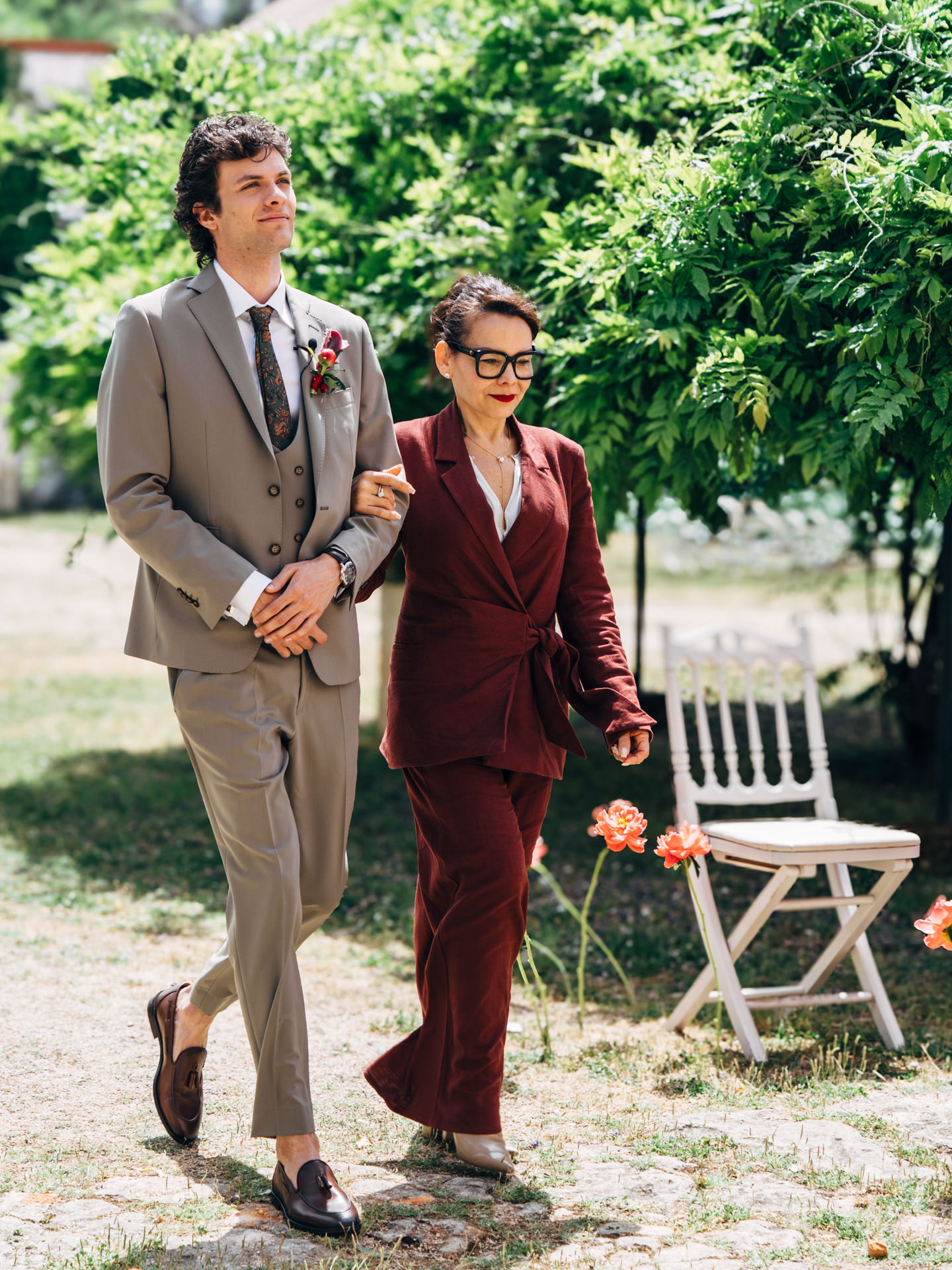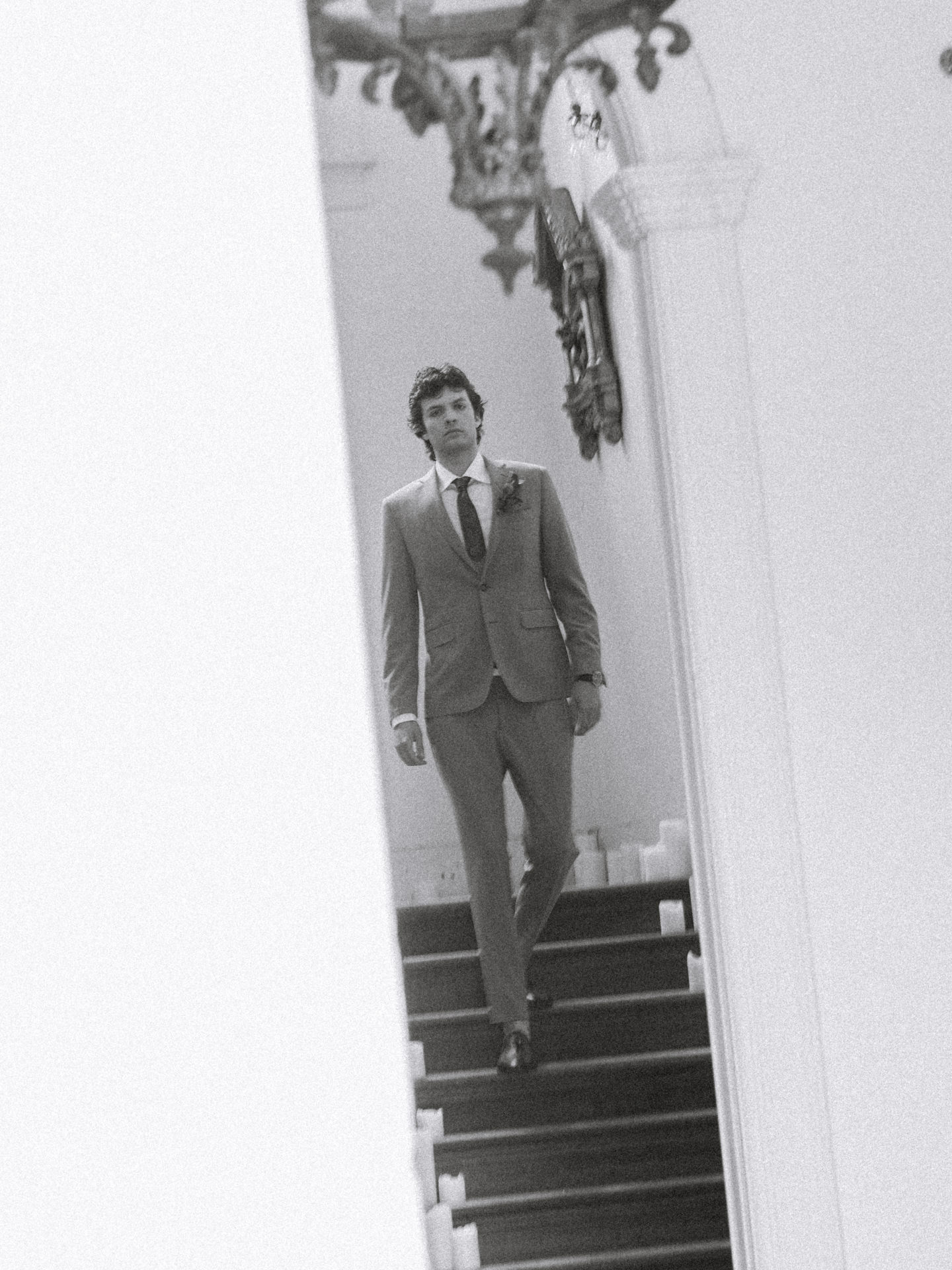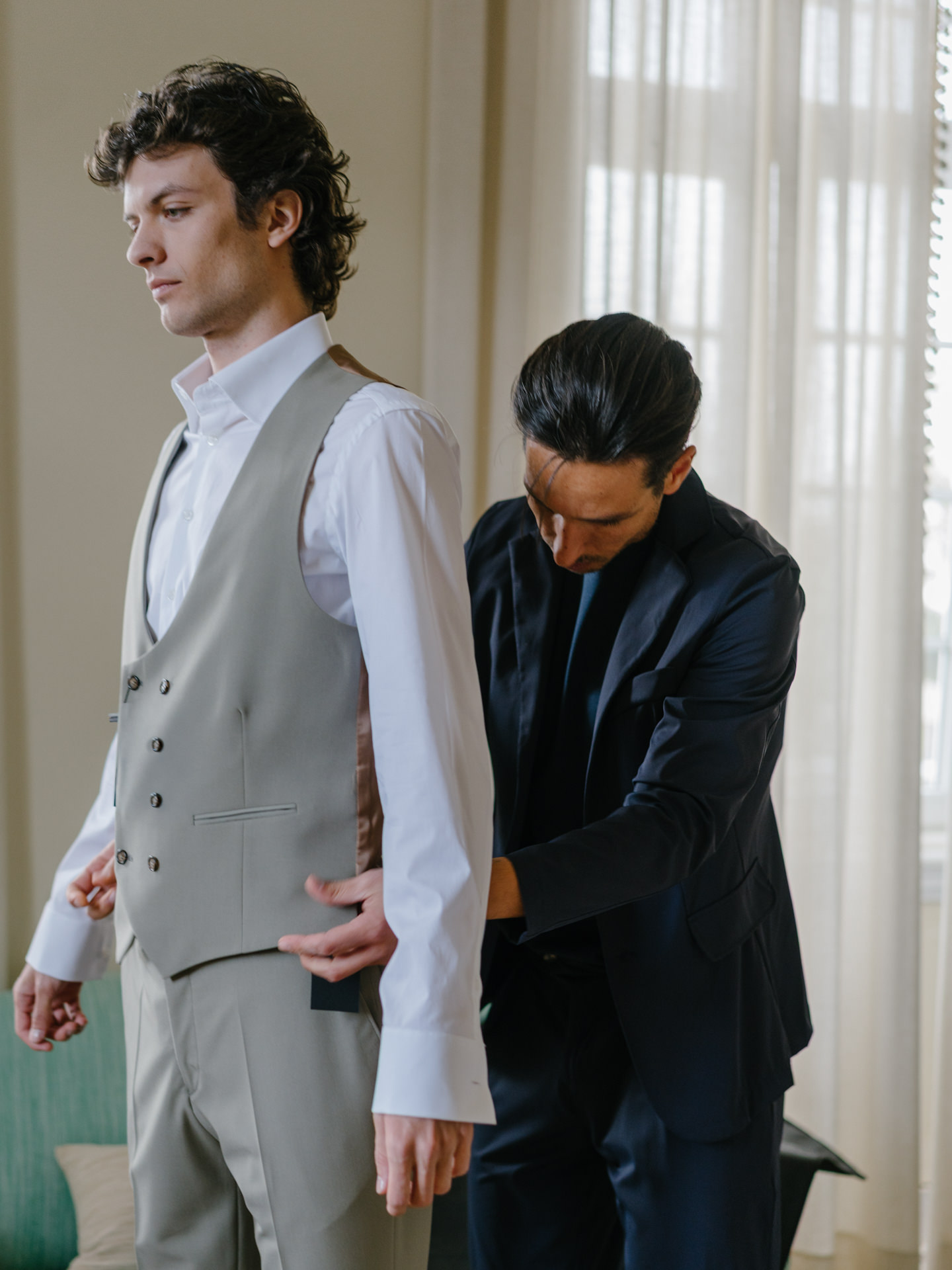 O noivo, vestido pelo Ricardo da Cavemen Suits, também seguiu esta lógica. Usámos dois fatos, ambos em tons verdes, dentro da mesma paleta, com uma inspiração italiana clara: colete, gravata, lenço… e sapatos sem meias. (Sim, somos fãs.)