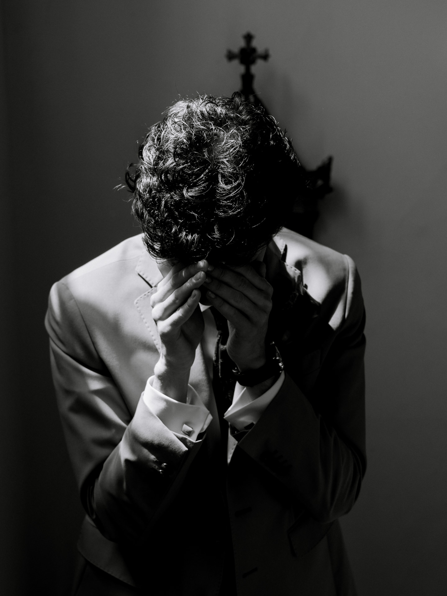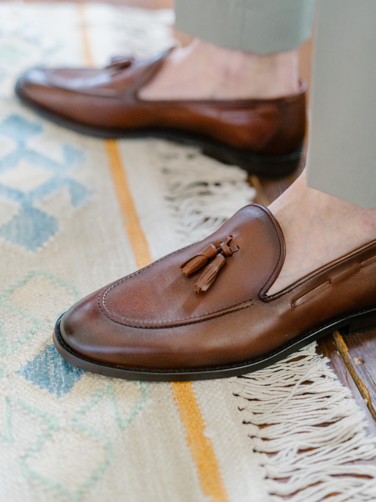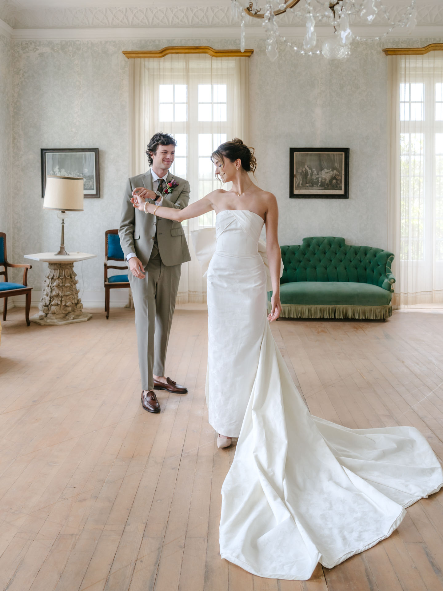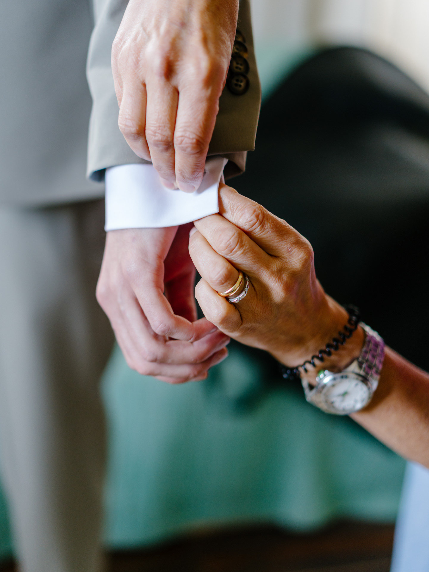 O noivo, vestido pelo Ricardo da Cavemen Suits, também seguiu esta lógica. Usámos dois fatos, ambos em tons verdes, dentro da mesma paleta, com uma inspiração italiana clara: colete, gravata, lenço… e sapatos sem meias. (Sim, somos fãs.)