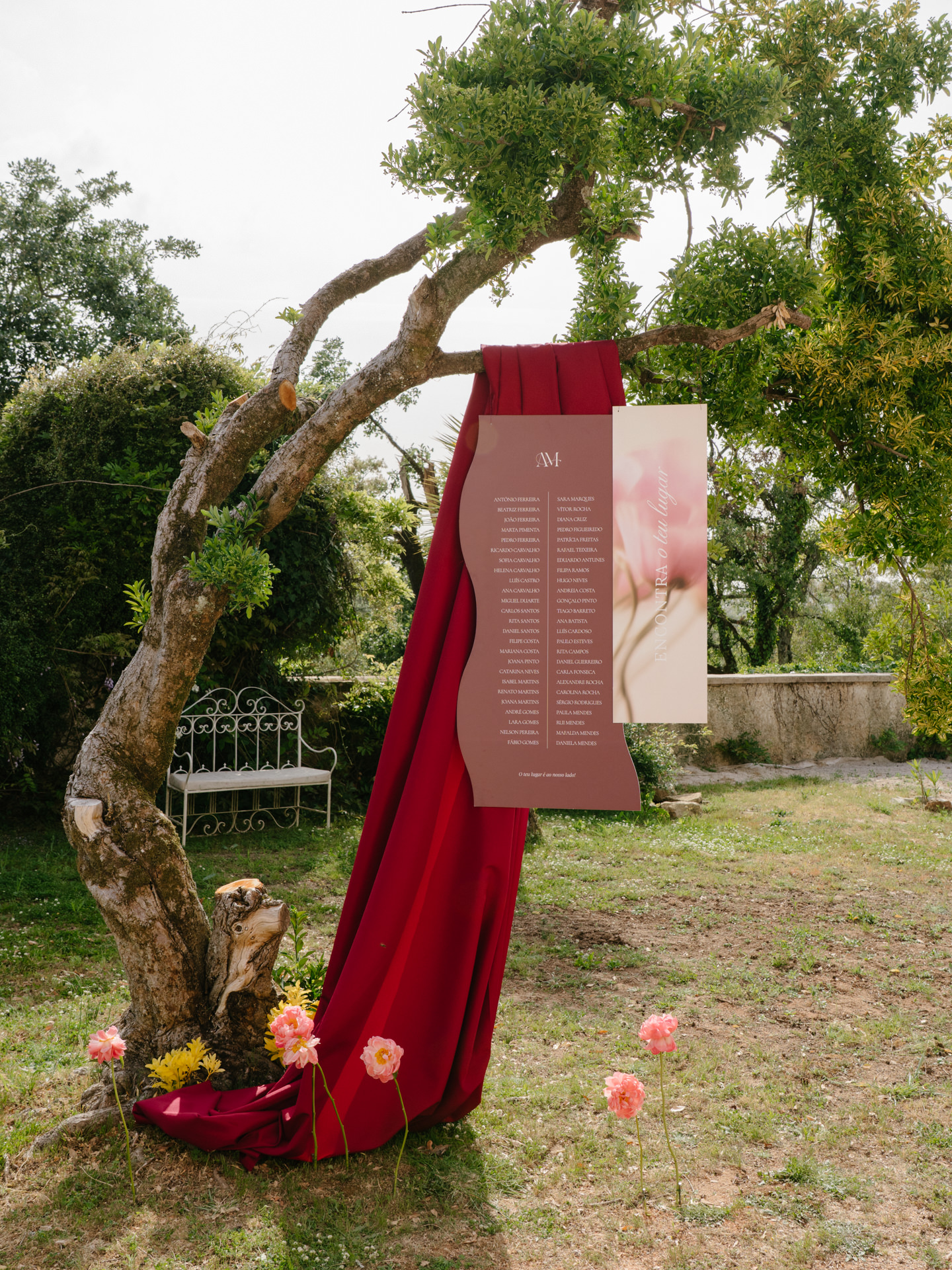 O seating plan foi colocado nas árvores, misturado com os tecidos, que. também se usaram nas mesas, criando uma continuidade visual com o resto do cenário. Uma escolha super acertada da Pura Carta.