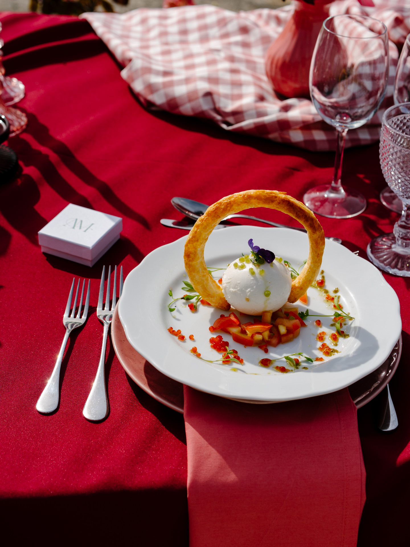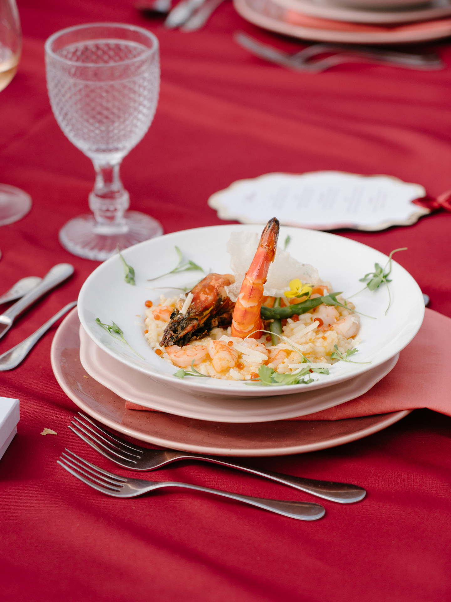 O menu, preparado pelo Palhinhas Gold Catering, seguiu também a inspiração italiana. E isto pode acontecer também no vosso casamento. Apesar de contarem com diversas opções, como sugestão, o catering pode ser personalizado para o vosso casamento.