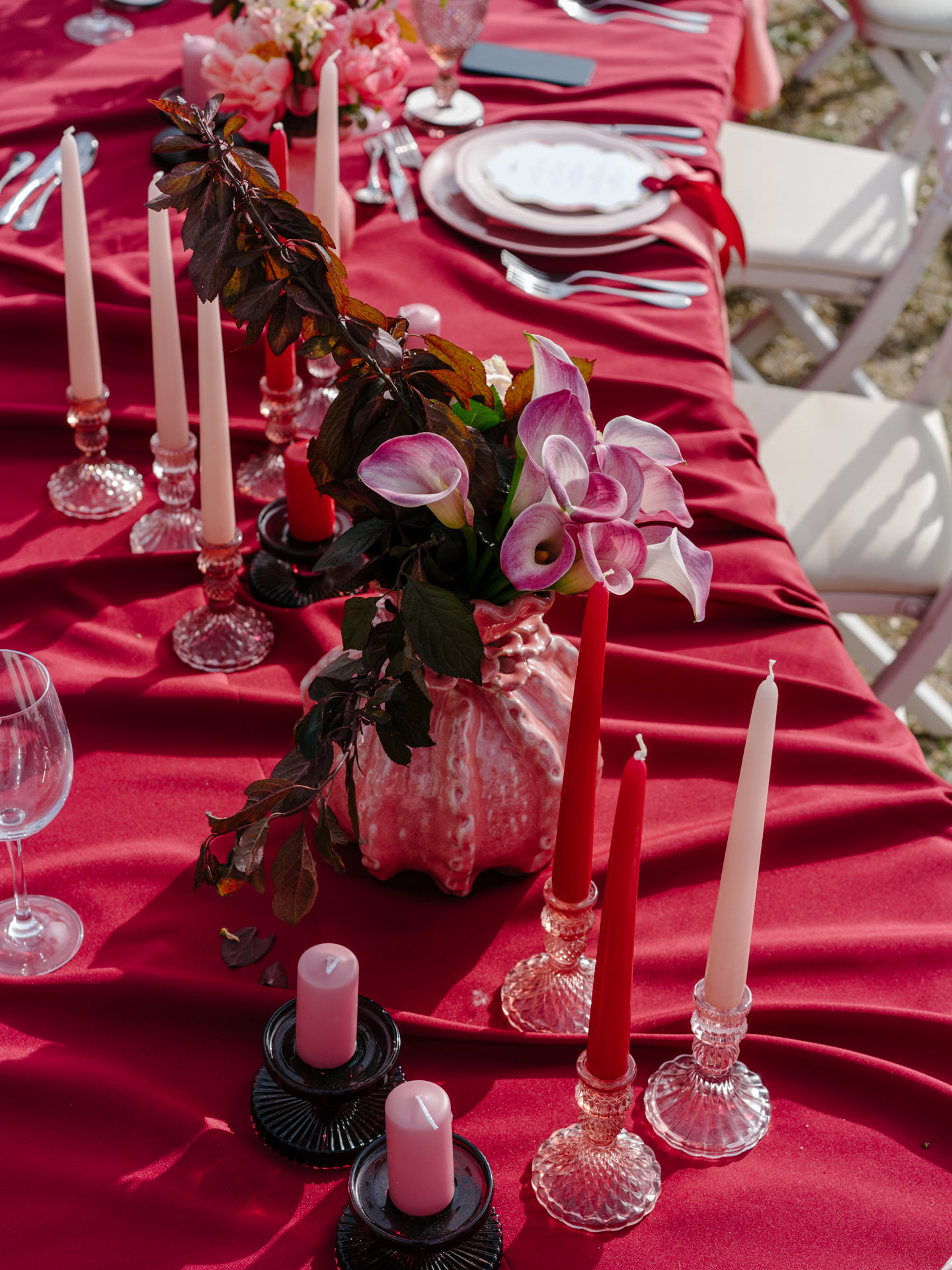 Para o jantar, optámos por uma mesa corrida em formato serpentina. Pode parecer técnico, mas na prática é uma mesa com curvas em “S”, que permite criar um ambiente mais fluido e menos rígido. A Helart não tinha qualquer dúvida quando viu o espaço e leu o conceito da direção criativa, que esta era a opção certa!