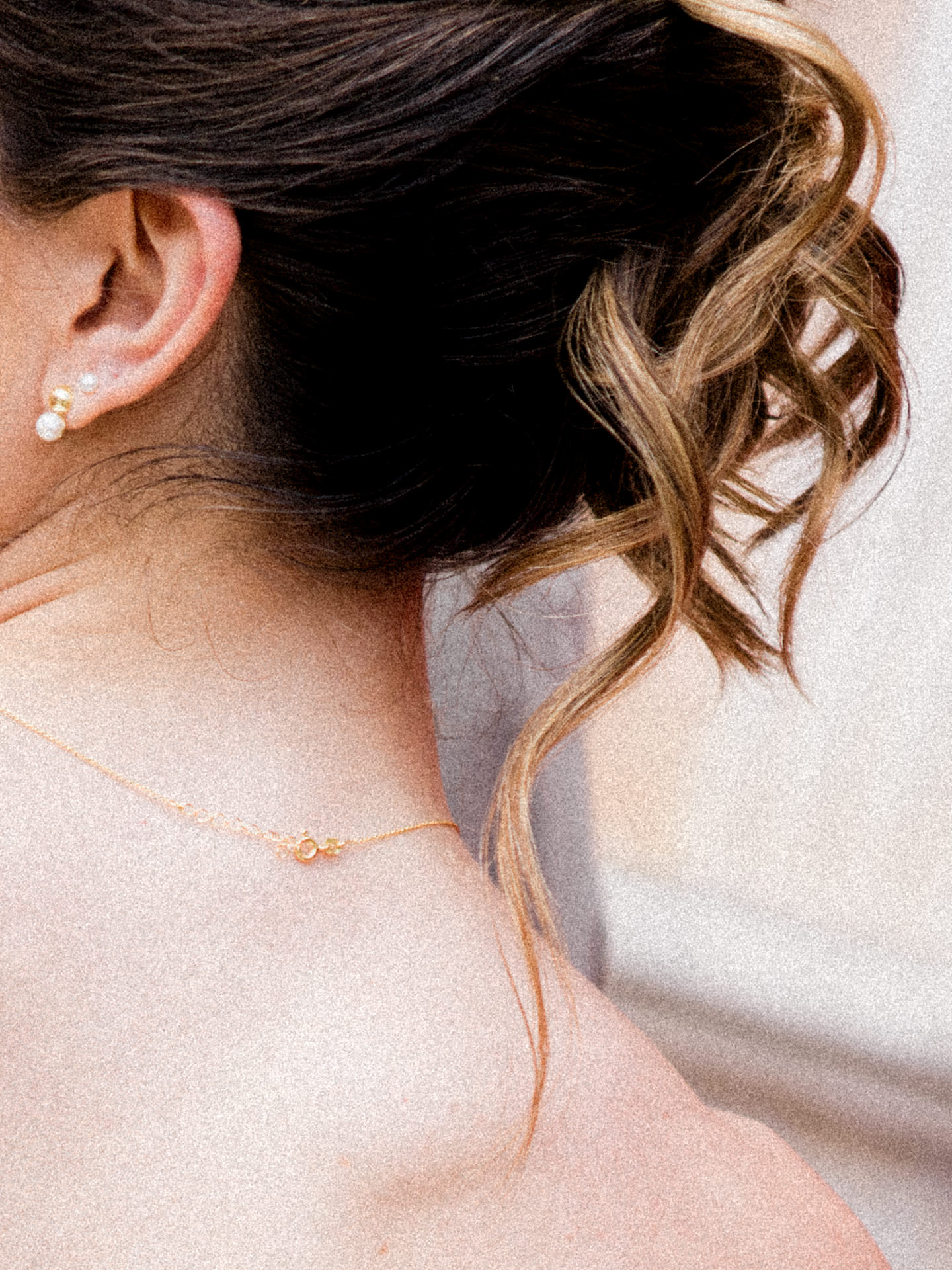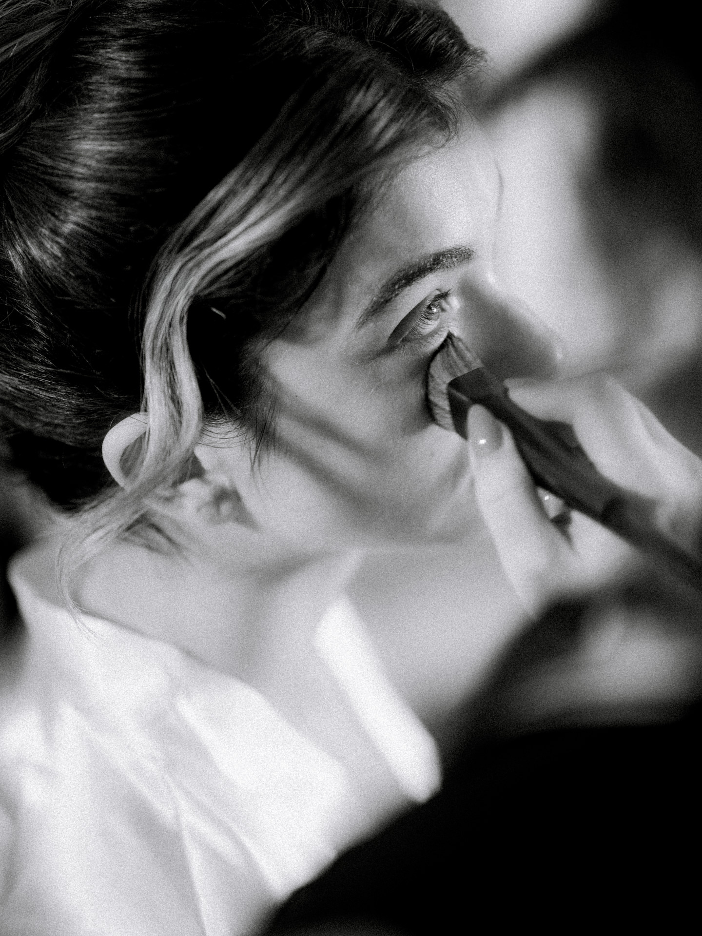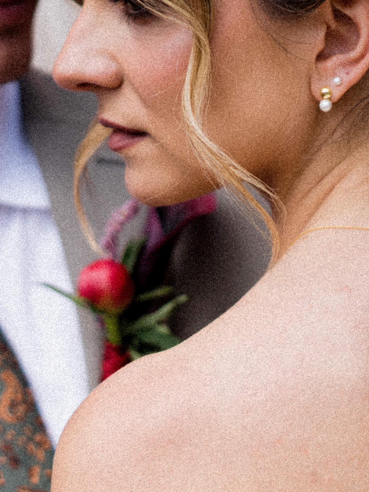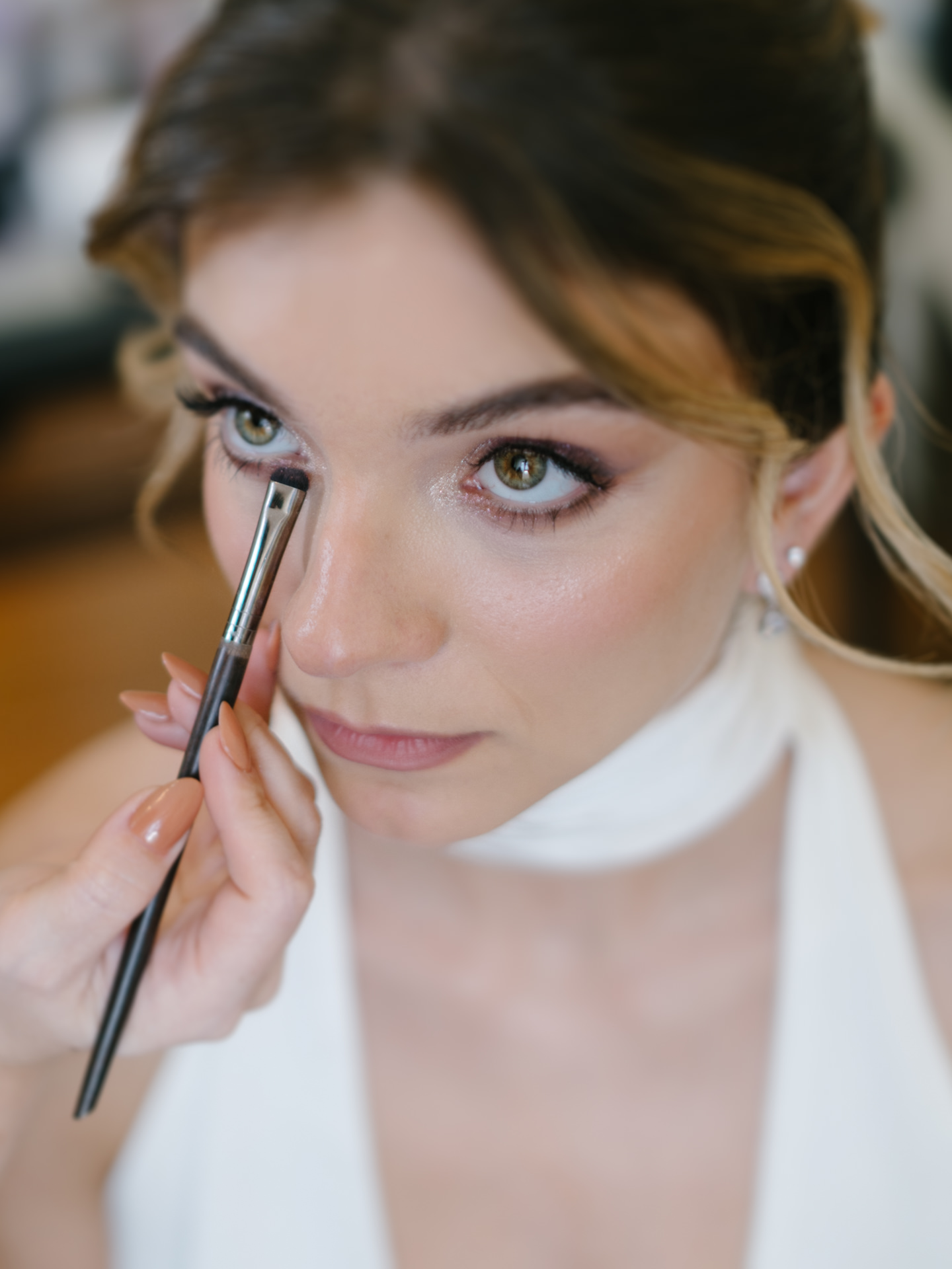 A Paula Pereira MakeUp & Beauty optou por um apanhado que funcionava perfeitamente nos dois looks - algo muito importante - e trabalhámos duas abordagens: uma maquilhagem mais suave para a cerimónia e, mais tarde, algo mais intenso, com lábios vermelhos.