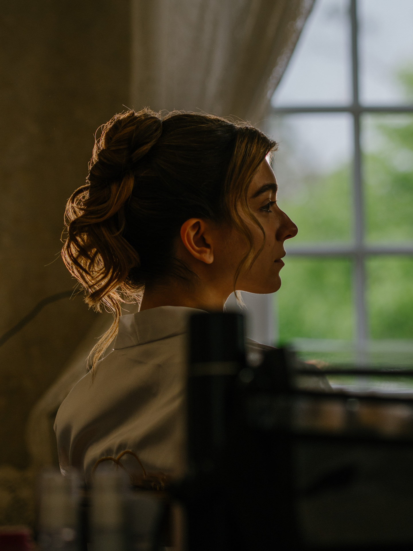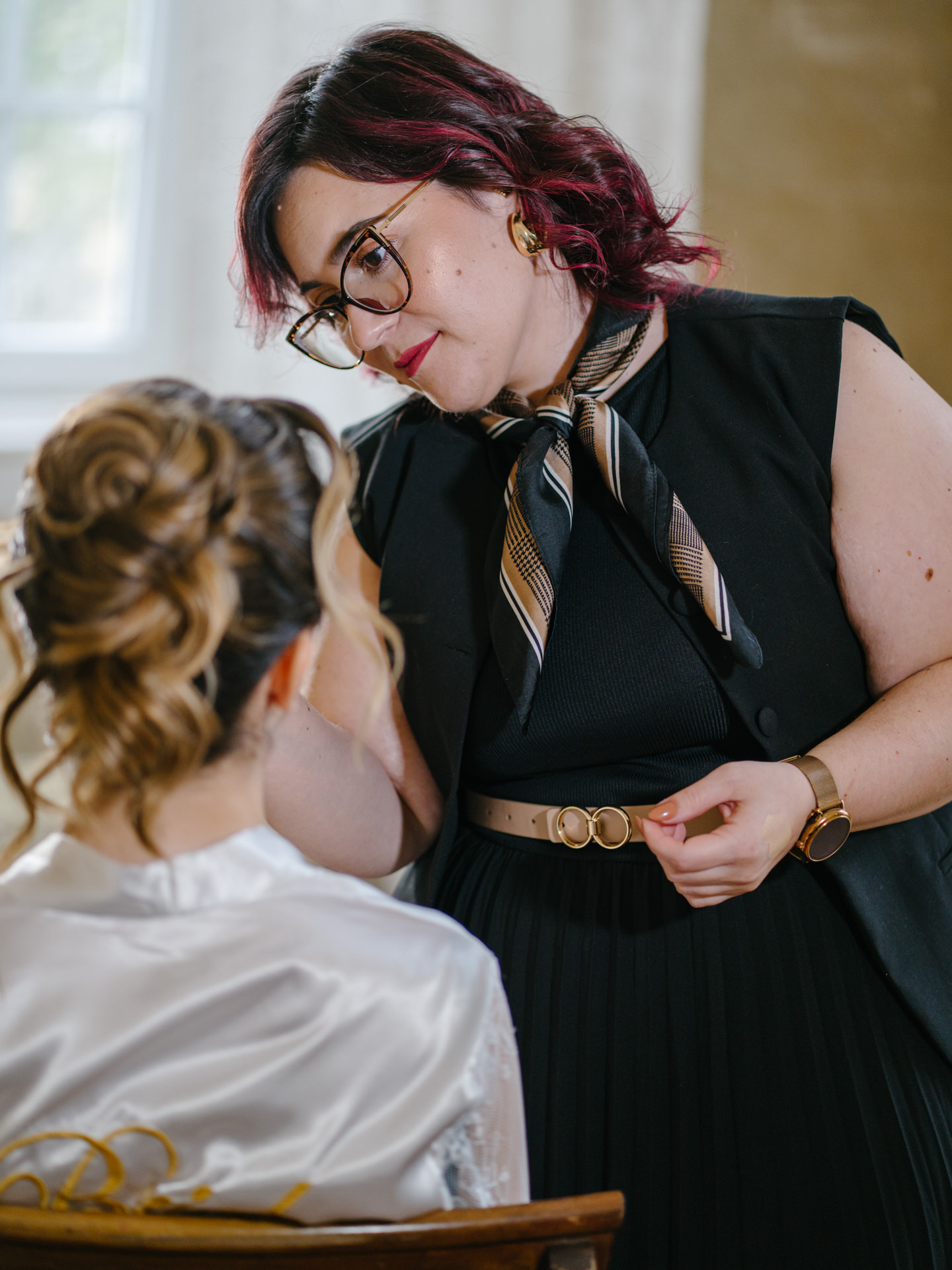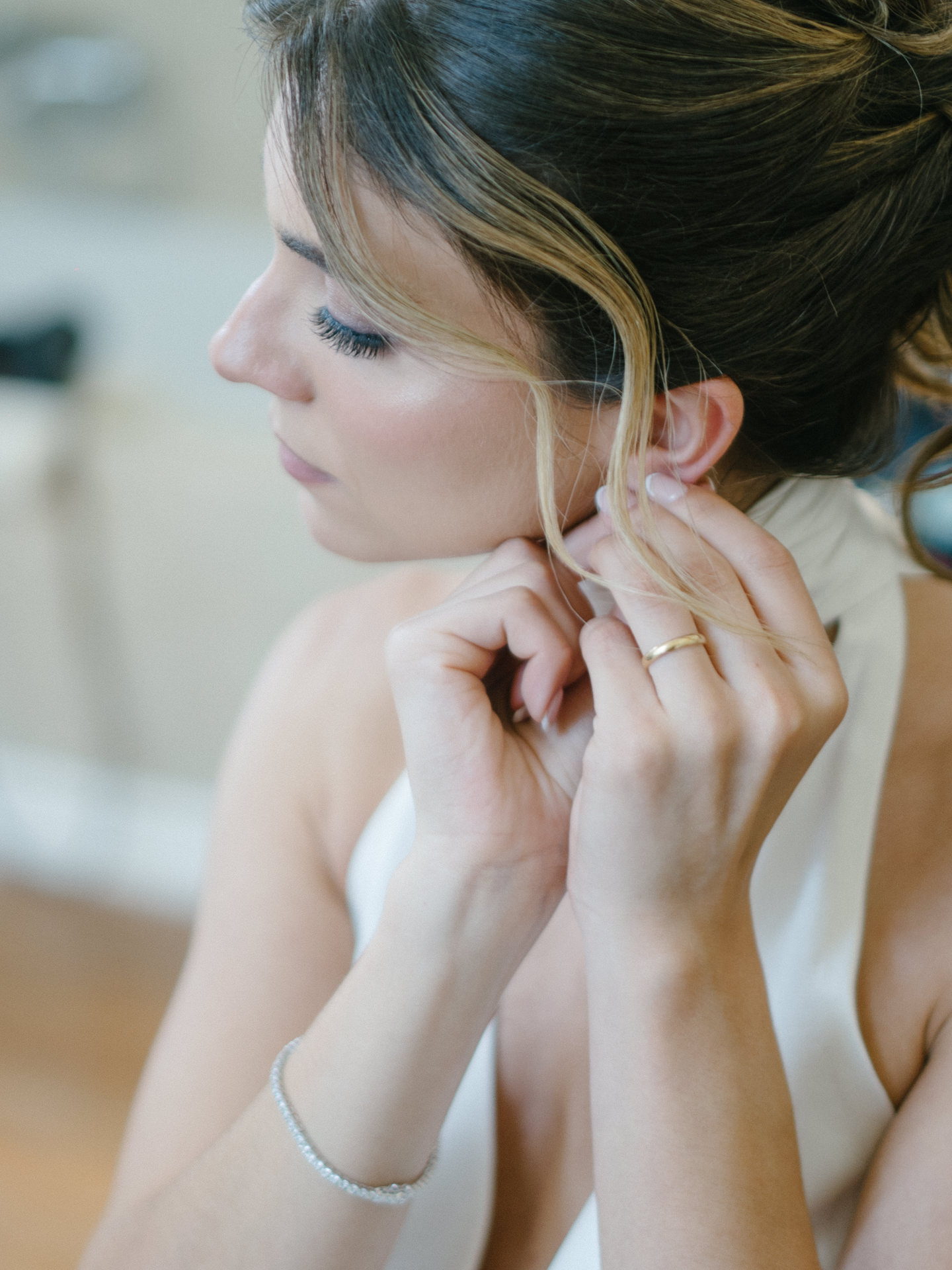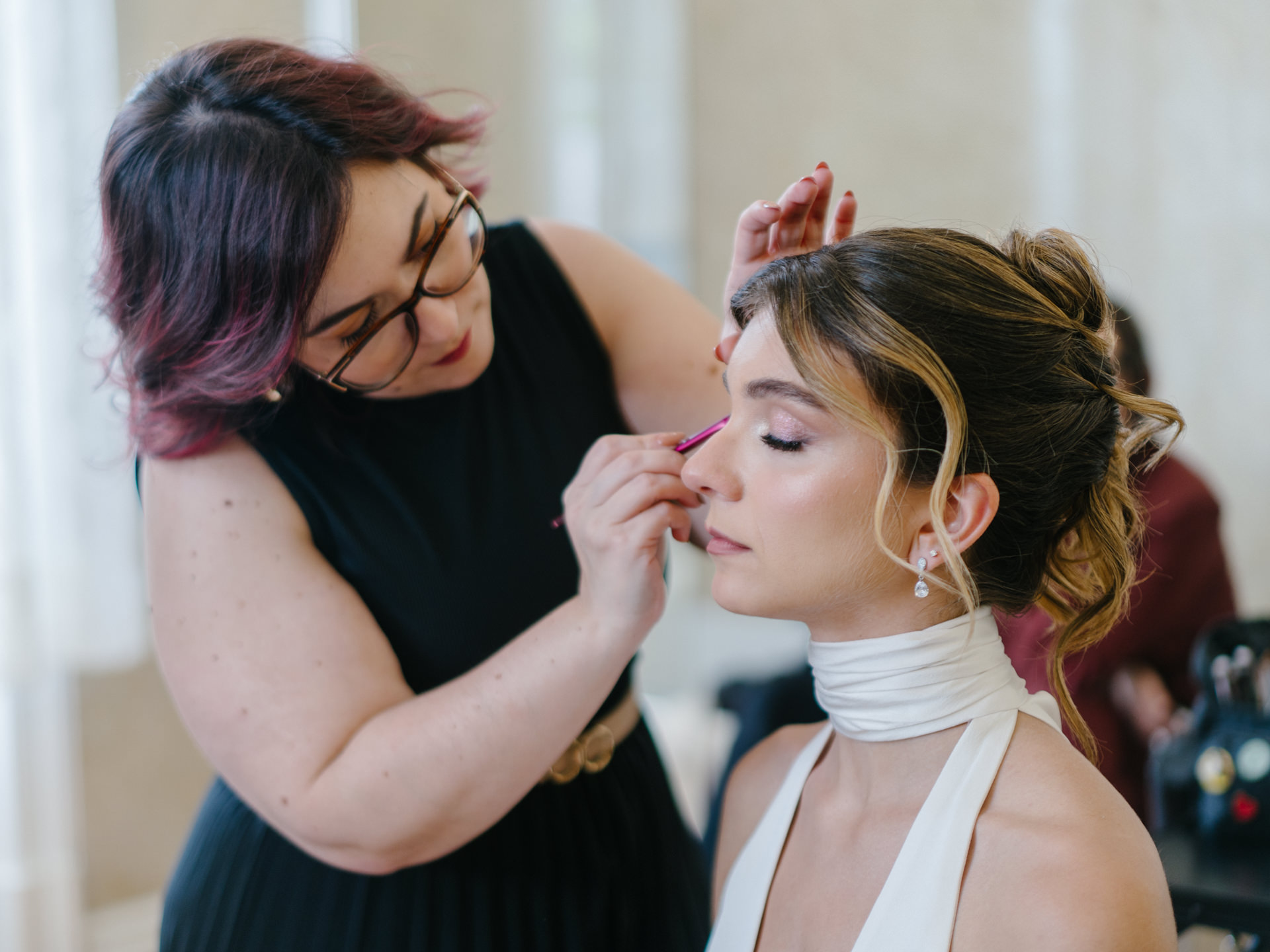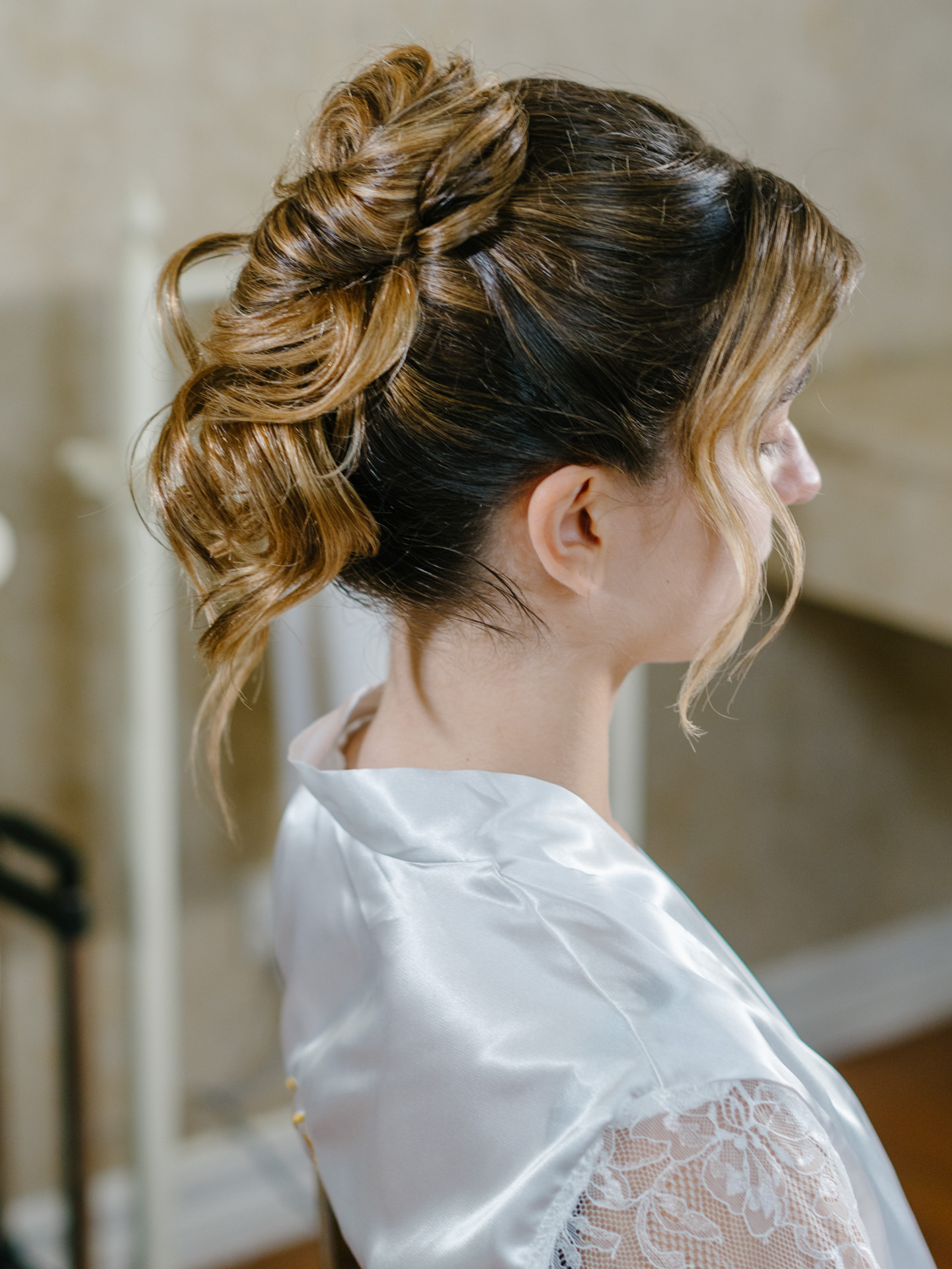 A Paula Pereira MakeUp & Beauty optou por um apanhado que funcionava perfeitamente nos dois looks - algo muito importante - e trabalhámos duas abordagens: uma maquilhagem mais suave para a cerimónia e, mais tarde, algo mais intenso, com lábios vermelhos.