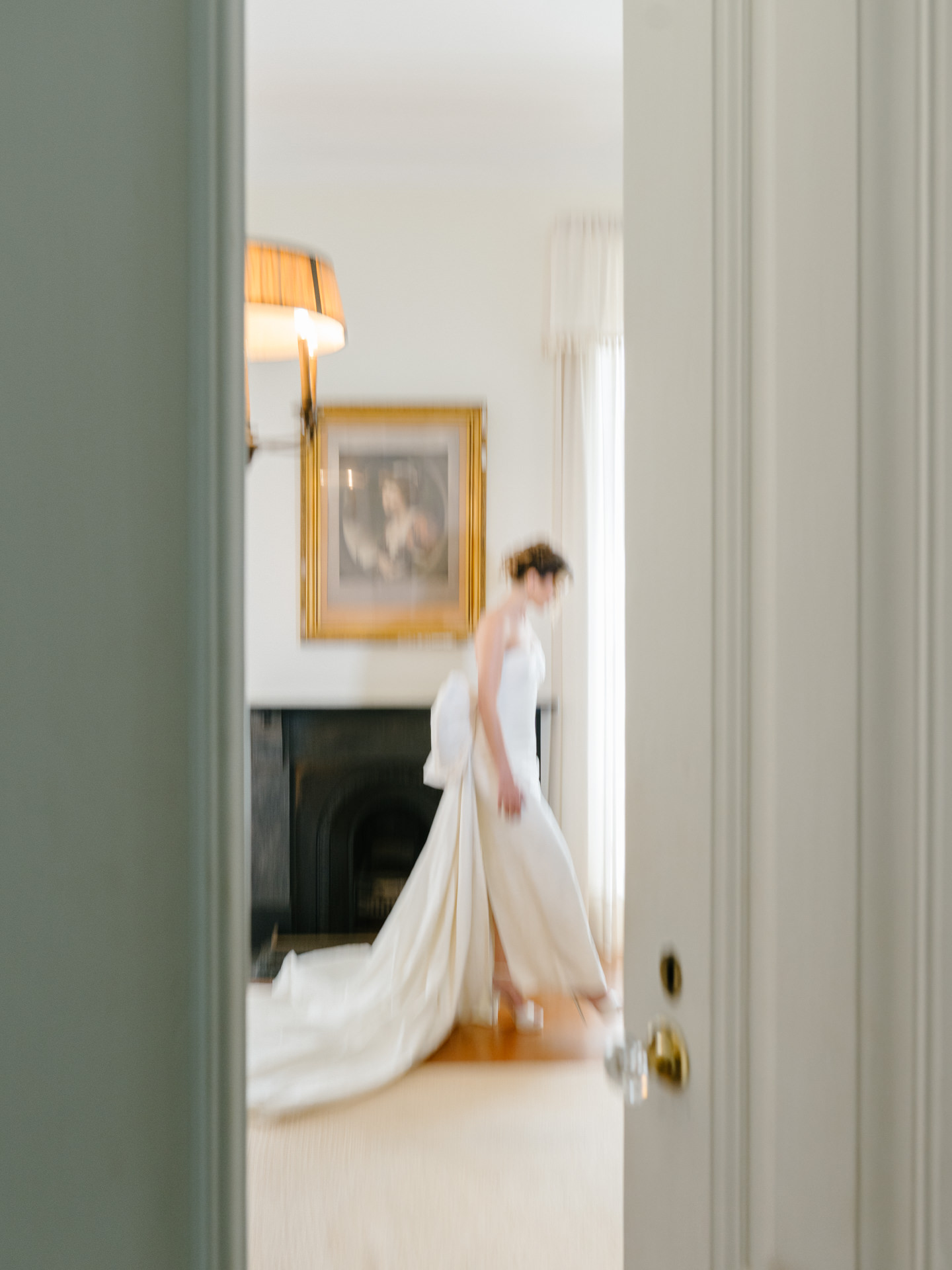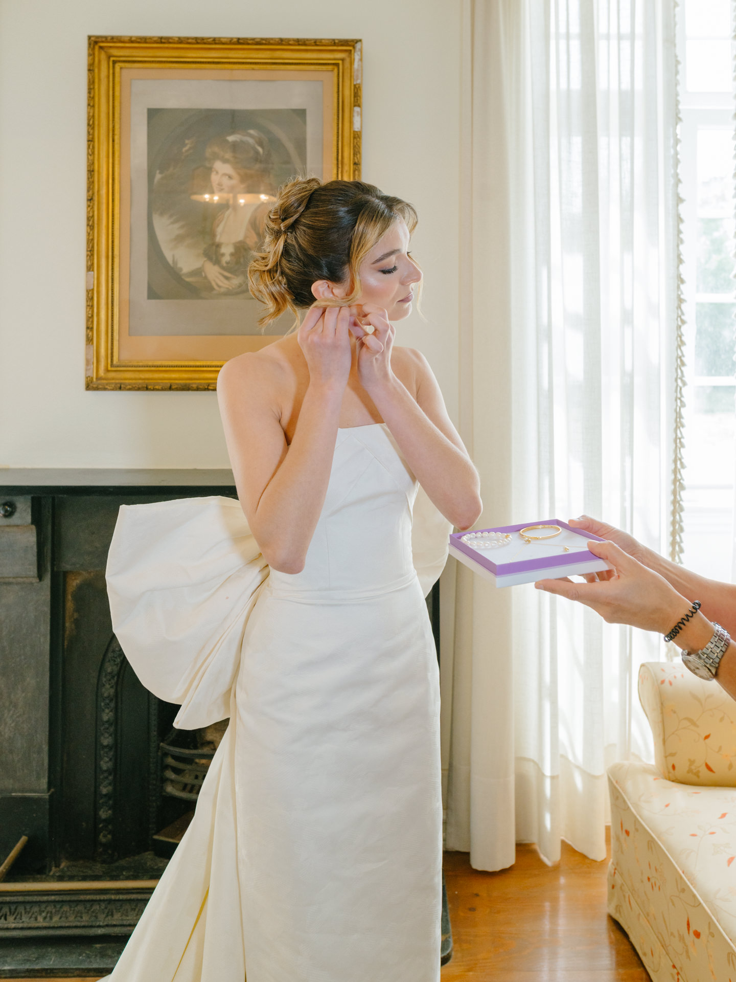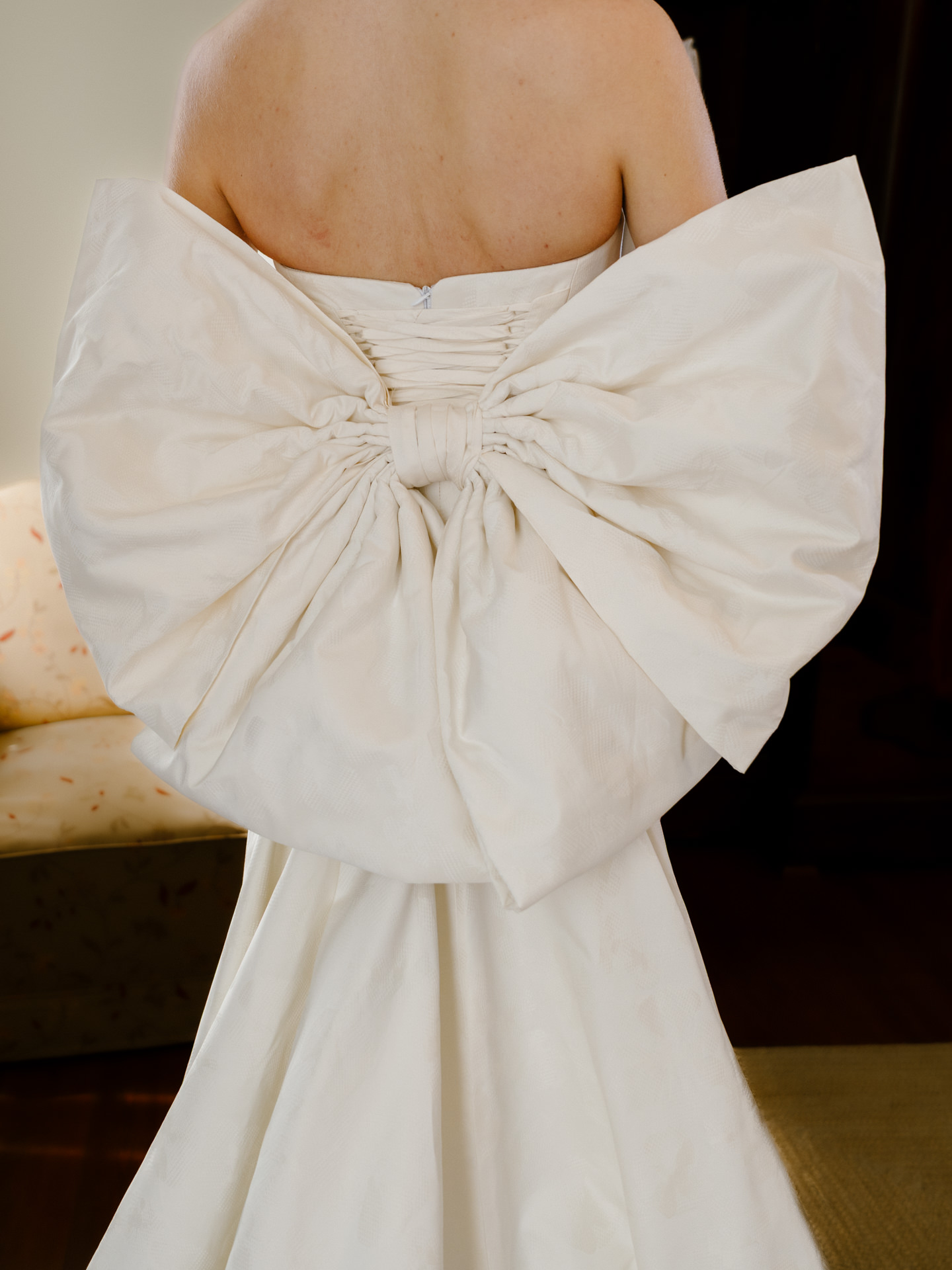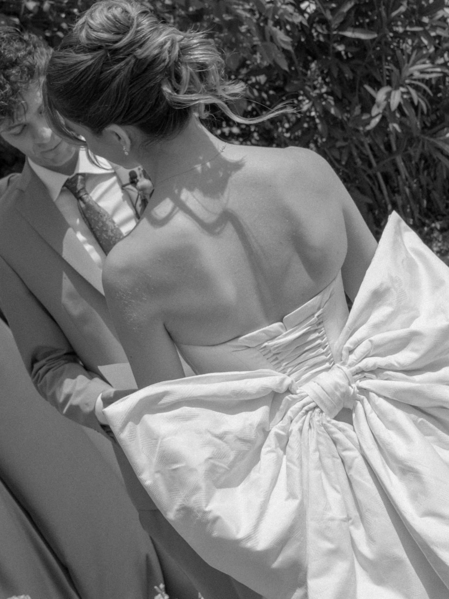 O vestido de noiva para a cerimónia civil tinha um laço absolutamente marcante, mas ao mesmo tempo delicado, com uma saia mais volumosa que acompanhava a silhueta da noiva sem perder elegância.