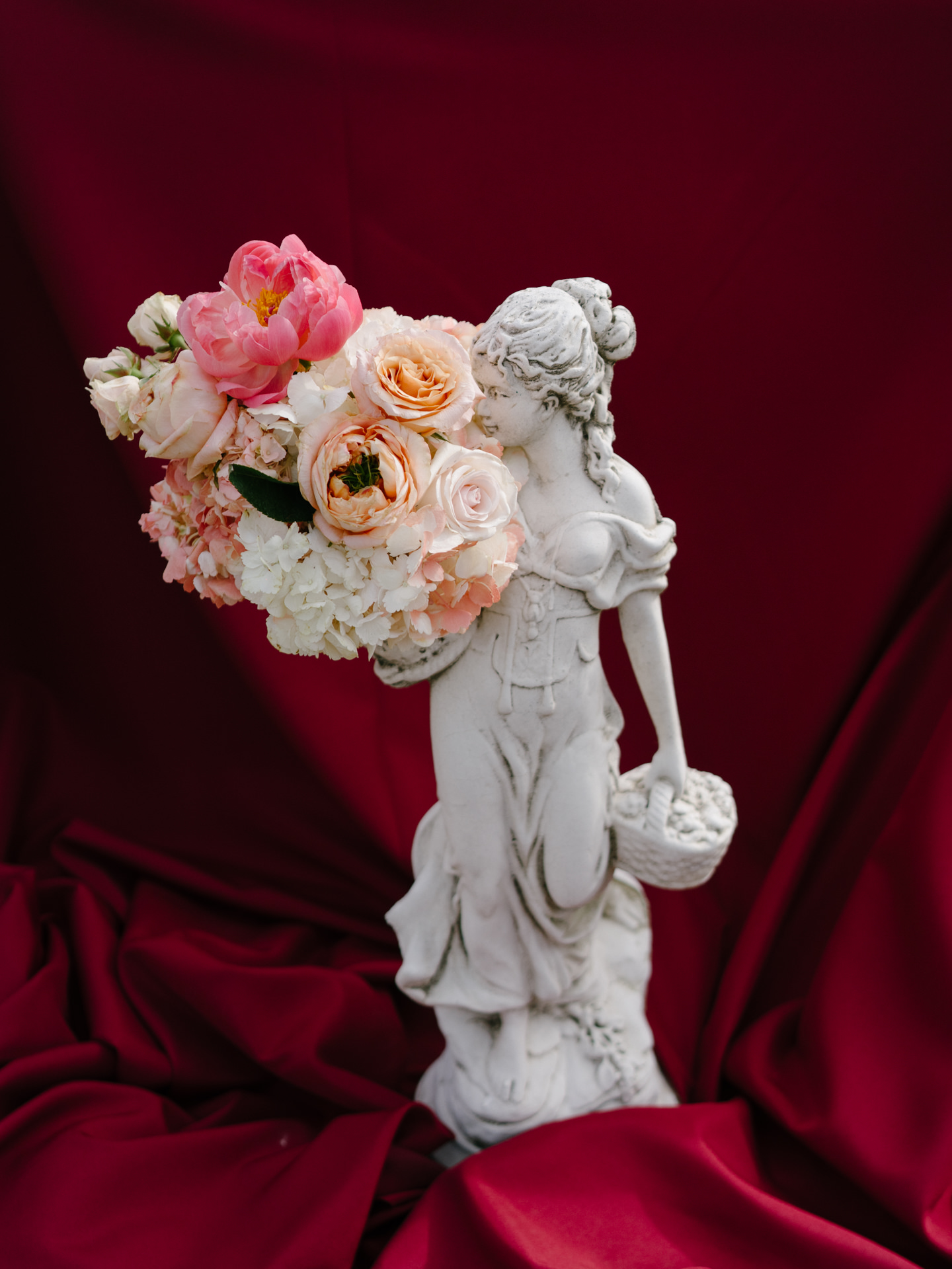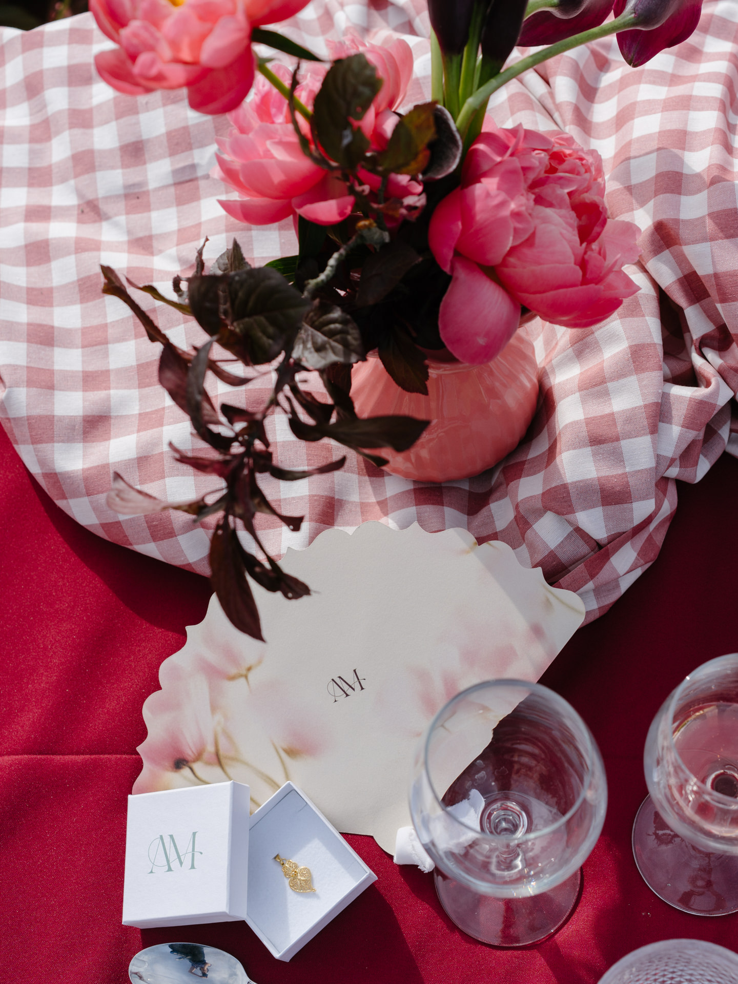 A paleta: bordô, rosa salmão, verdes e beges, que foi usada tanto na decoração, como no estacionário.