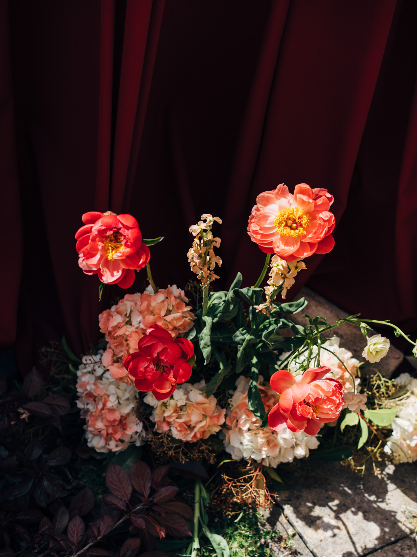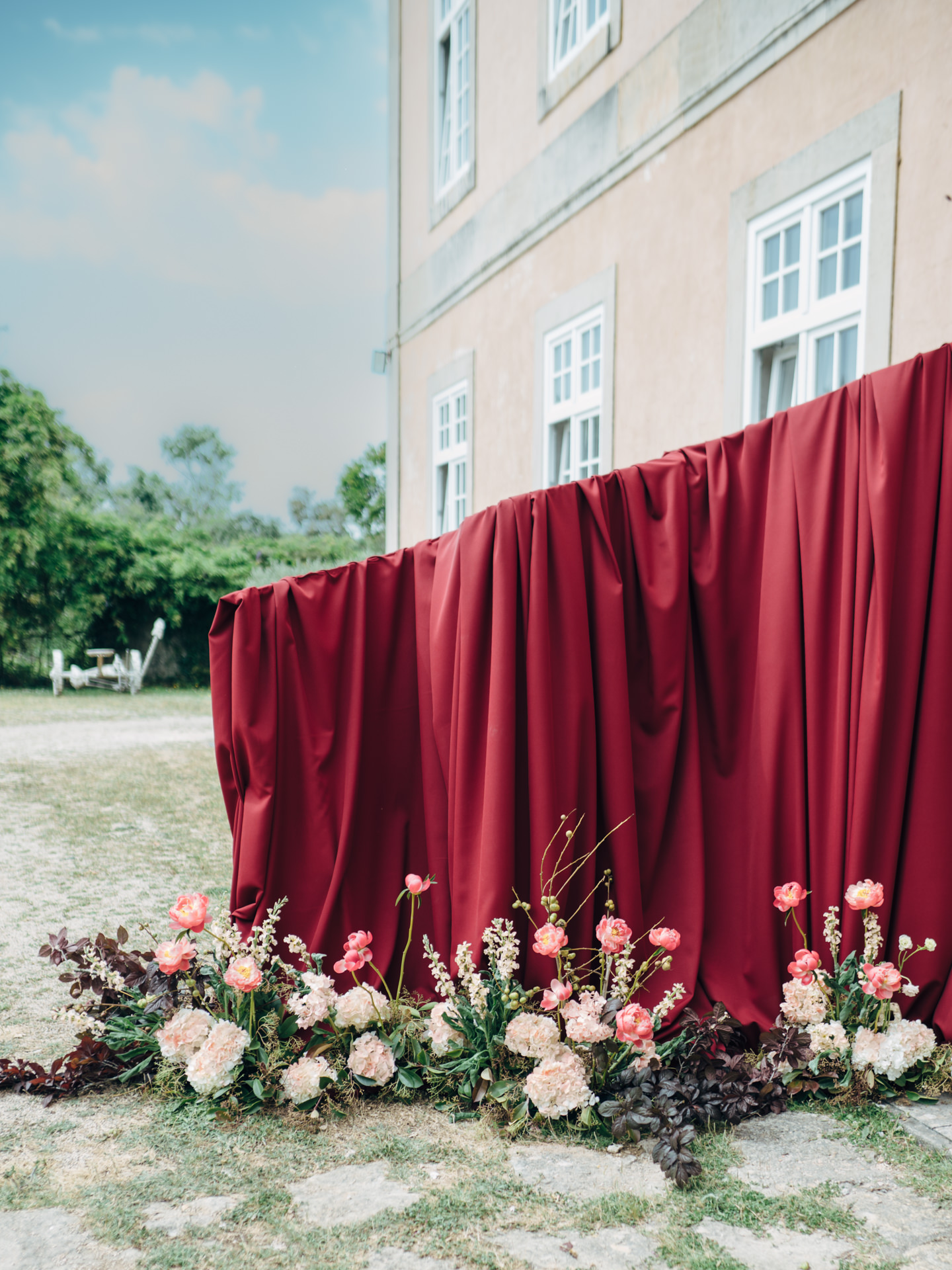 Os arranjos florais foram criados no local e distribuídos ao longo do caminho até ao altar, e foram fundamentais para a combinação dos tecidos colocados nas estruturas, no altar, criando uma ligação natural entre todos os elementos.