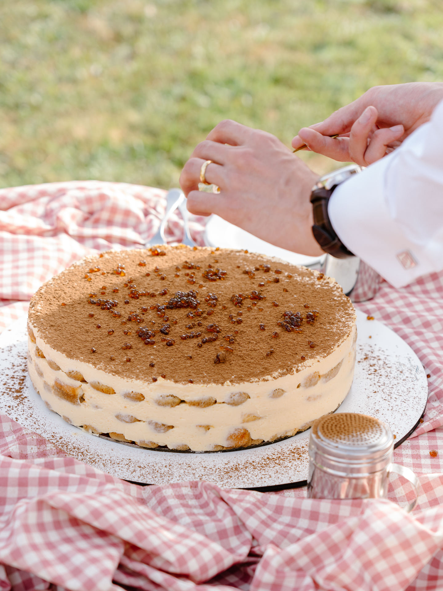 Optámos por um tiramisù. Mas não apenas como bolo, foi finalizado pelos próprios noivos no momento. Além de ser visualmente interessante, funciona muito bem como sobremesa.