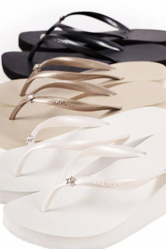 Há ainda duas outras colecções de Havaianas que podem agradar às noivas mais descontraídas: a Flash Sweet e a Slim Tribal. Ambas de linhas minimalistas e desenvolvidas em tons de dourado, emprestam elegância ao seu pé e permitem-lhe dançar a noite toda sobre a areia com a sua cara-metade. A Flash Sweet é a primeira Havaiana de tiras entrançadas.
