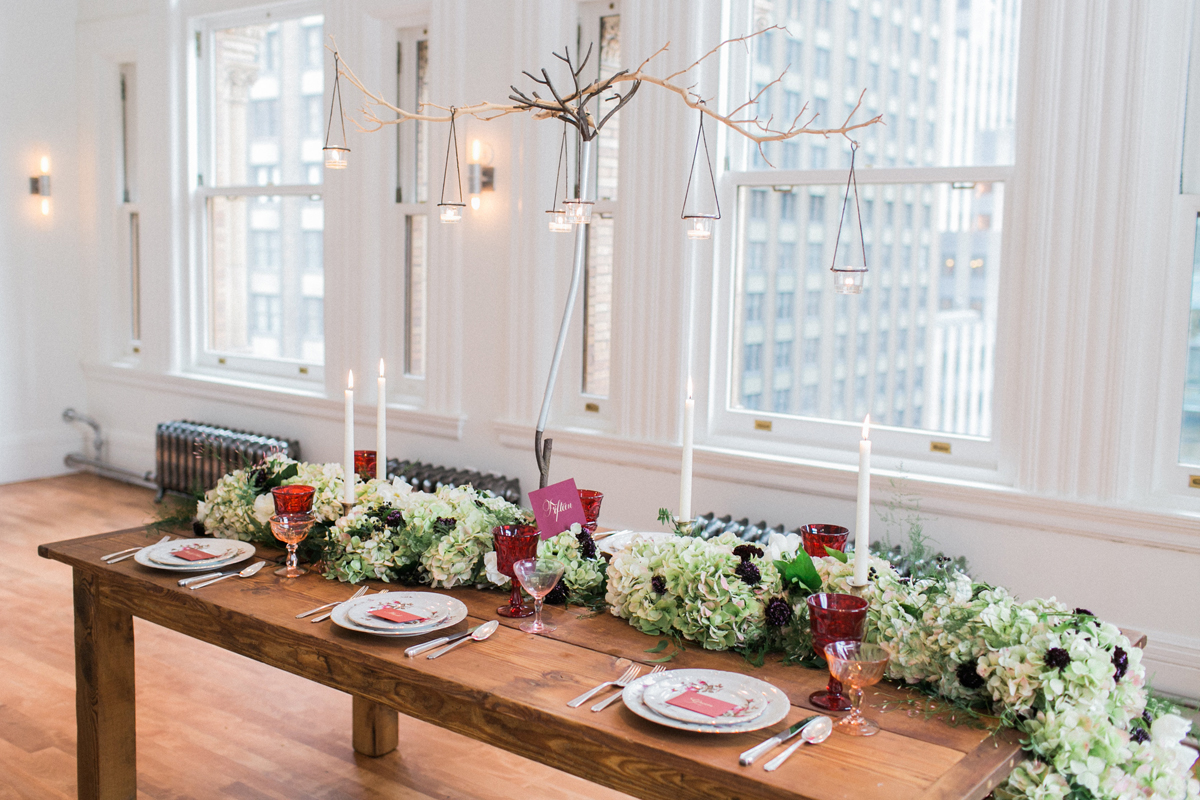 Nesta outra reportagem, da autoria da Alexis June Weddings, a cor Marsala é incorporada quer através das bebidas, quer através dos vários elementos que constituem a mesa, nomeadamente, os copos e a louça.