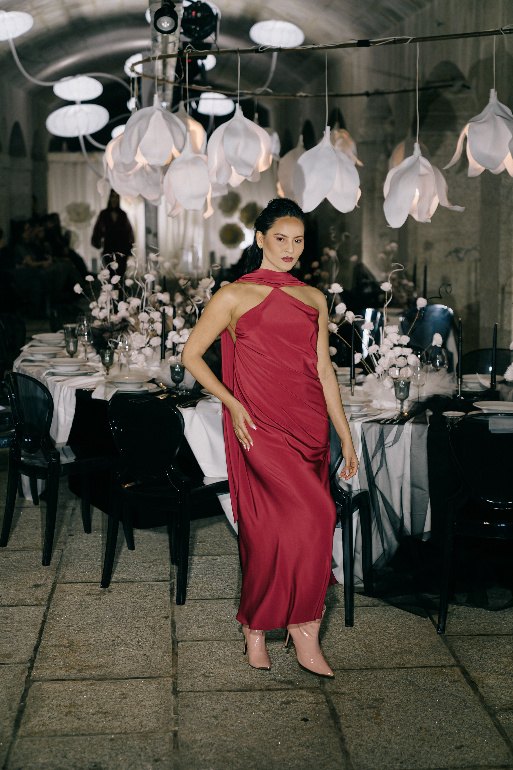 O dress code Black Tie exige vestidos longos e sofisticados, preferencialmente em tecidos nobres como seda, cetim ou veludo. Bordados, brilhos e aplicações são bem-vindos, desde que mantenham a elegância. Acessórios requintados, como joias e clutch sofisticada, complementam o look, assim como um penteado elaborado e uma maquilhagem impecável.